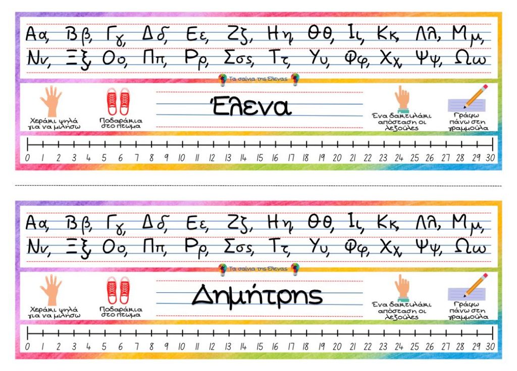 Καρτελάκια για το θρανίο των μικρών μας μαθητών για το όνομά τους αλλά και για υπενθύμιση των βασικών κανόνων, της Αλφαβήτα και των αριθμών.